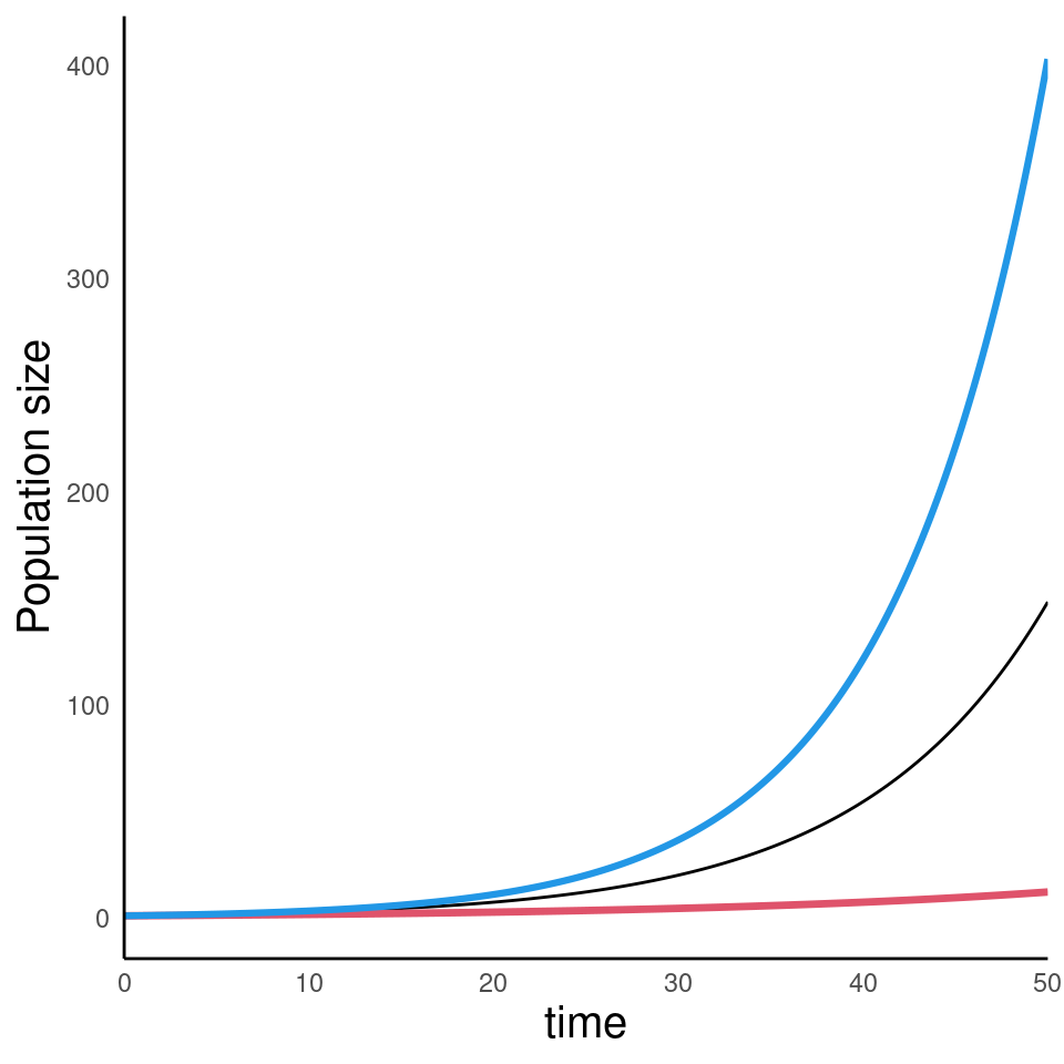 Populations grow when there are more births than deaths (\((b-d) > 0\); aka \(r > 0\))