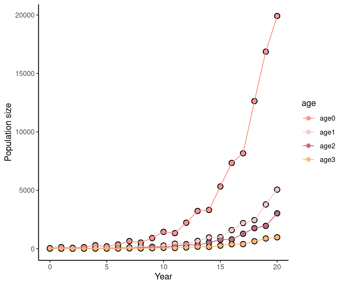 xlab("Year") + ylab("Population size") +