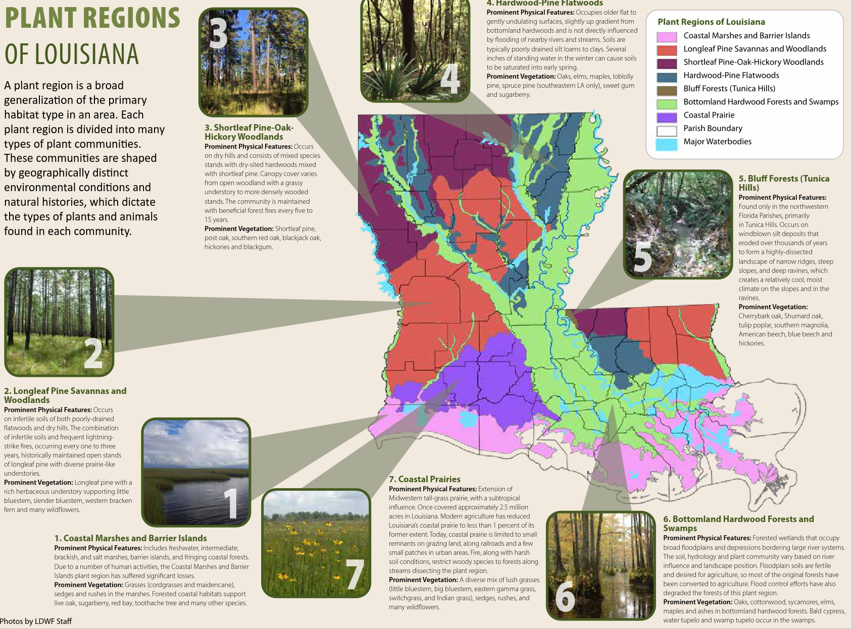 Prominent Physical Features: Coastal Prairies Prominent Physical Features: Extension of Midwestern tall-grass prairie, with a subtropical influence. Once covered approximately 2.5 million acres in Louisiana. Modern agriculture has reduced Louisiana’s coastal prairie to less than 1 percent of its former extent. Today, coastal prairie is limited to small remnants on grazing land, along railroads and a few small patches in urban areas. Fire, along with harsh soil conditions, restrict woody species to forests along streams dissecting the plant region