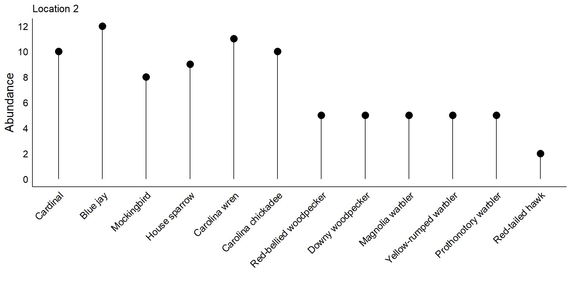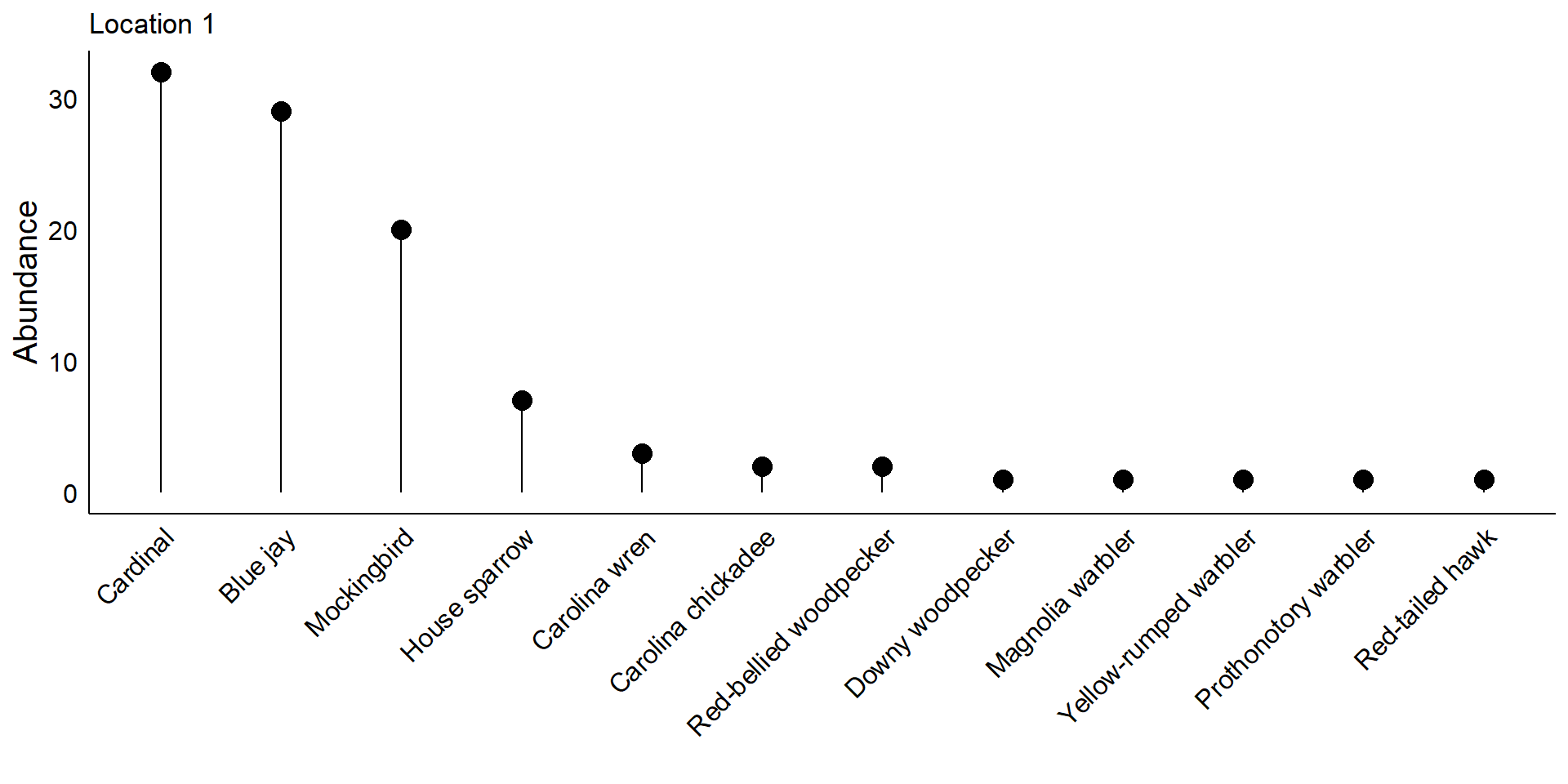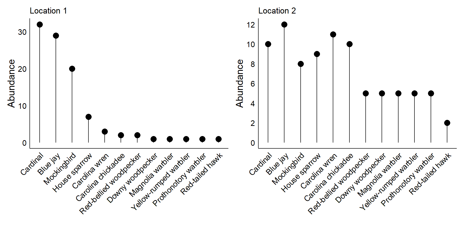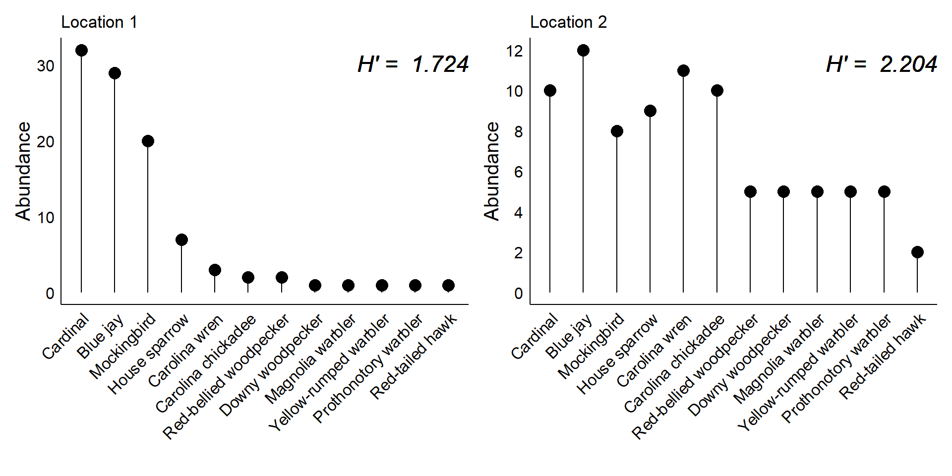 In the first location, the bird community is dominated by just a few species: