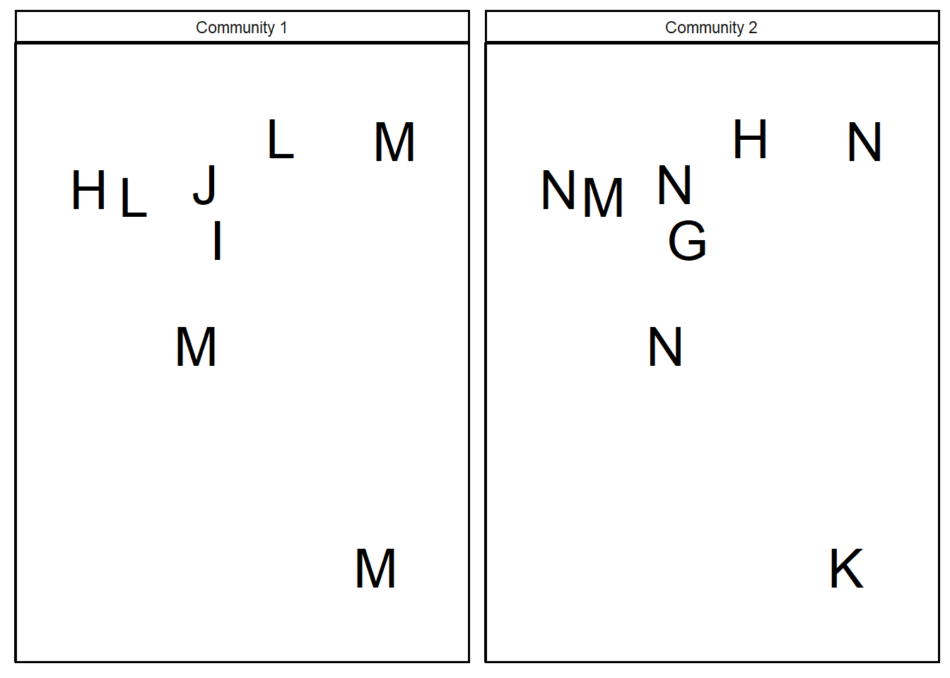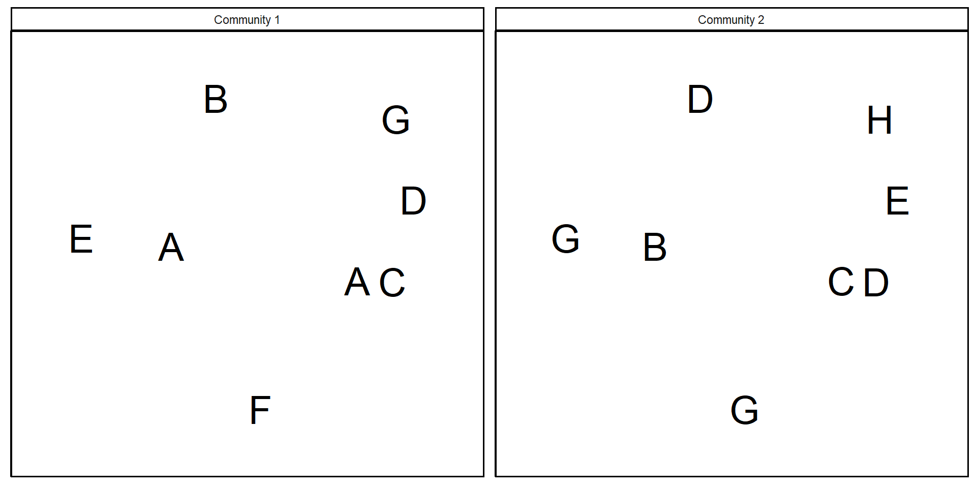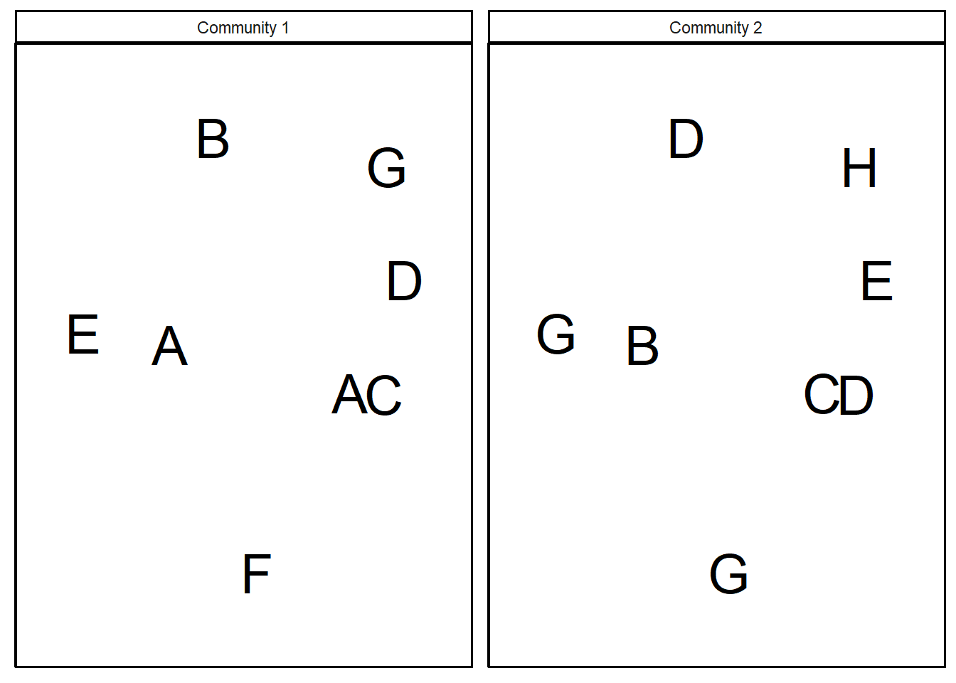 In the following communities, each species is represented by a different letter.